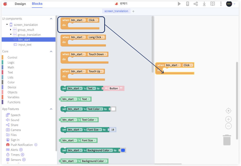 컴포넌트에서 group_translation 안의 btn_start를 선택하여 Click 블록을 꺼냅니다.
