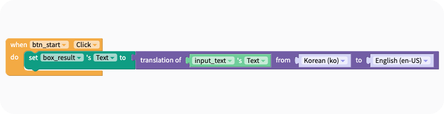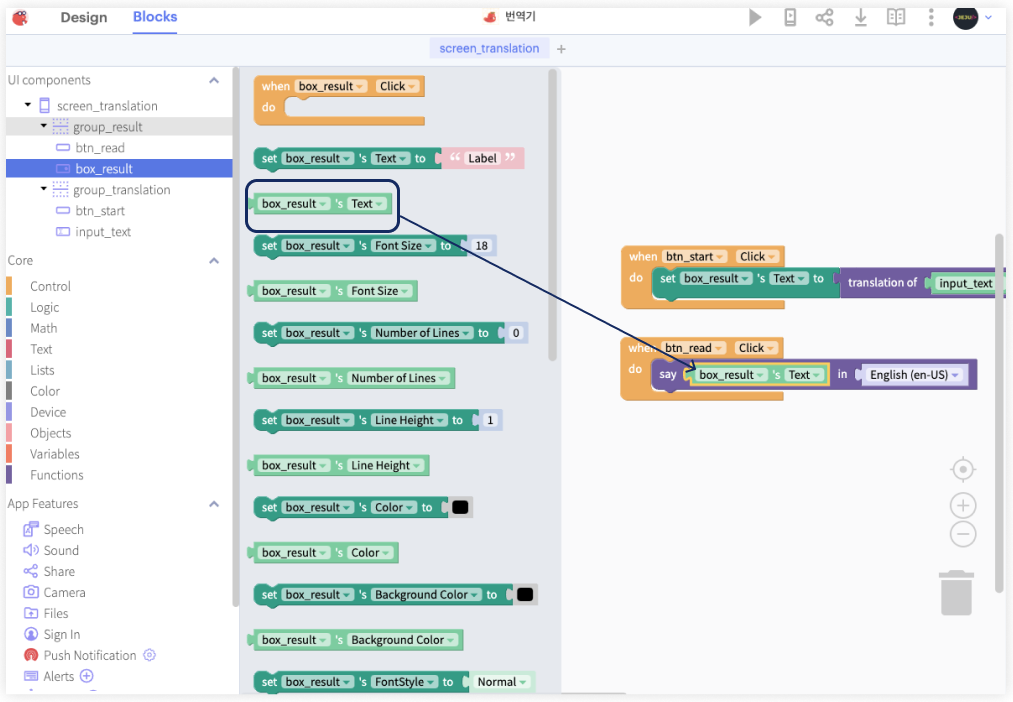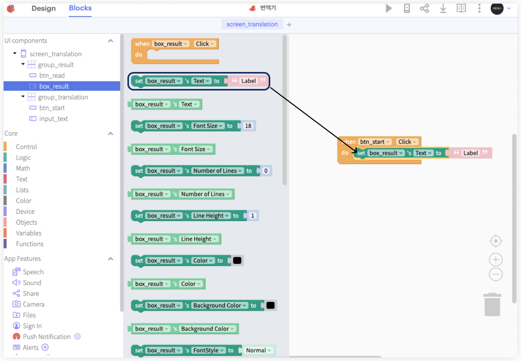 box_result에 번역된 결과물을 표시하기 위해 번역 기능 블록을 드래그 앤 드롭하여 box_result 블록의 "Label" 자리에 조립해 줍니다.