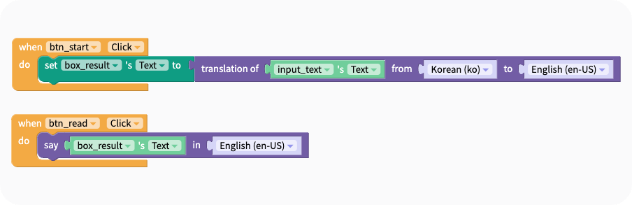 이렇게 번역기 앱의 블록코딩이 완성되었습니다!