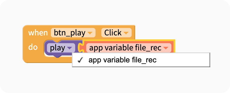 위에서 녹음된 오디오 파일을 변수 file_rec에 담아놓았으므로 Variables에서 file_rec를 드래그 앤 드롭하여 조립해 주도록 하겠습니다.